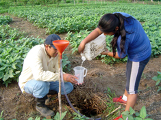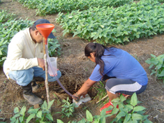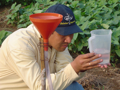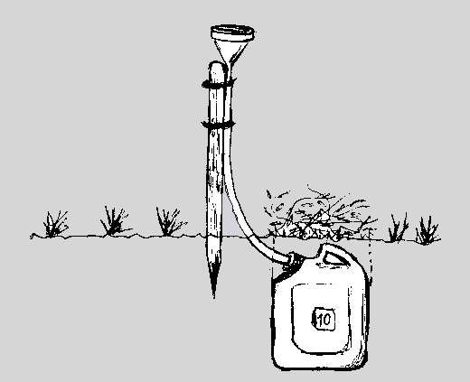 Ejemplo. En la localidad de Mizque se registró las lluvias acumuladas con 700 cc (0.7 l) en el lapso de una semana. El diámetro del embudo mide 17 cm (r = 8.5 cm). Se realizará el cálculo de la precipitación caída en esa semana. Para ello, se puede directamente reemplazar en la fórmula correspondiente a altura (h): h = (V/( π * r2))*10 h = (700/(3.1416*(8.5)2))*10 h = 30.89 mm de precipitación durante la semana La figura 1 ilustra la colocación del pluviómetro casero en campo.