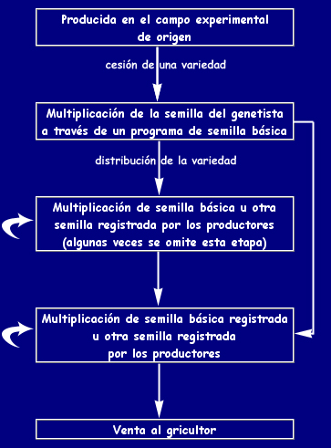 | Etapas en la multiplicación y distribución de una nueva variedad de semilla |