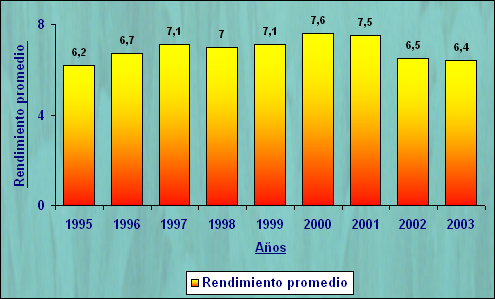| Rendimiento promedio (t/ha) (en base seca) | 6.2 | 6.7 | 7.1 | 7.0 | 7.1 | 7.6 | 7.5 | 6.5 | 6.4 |