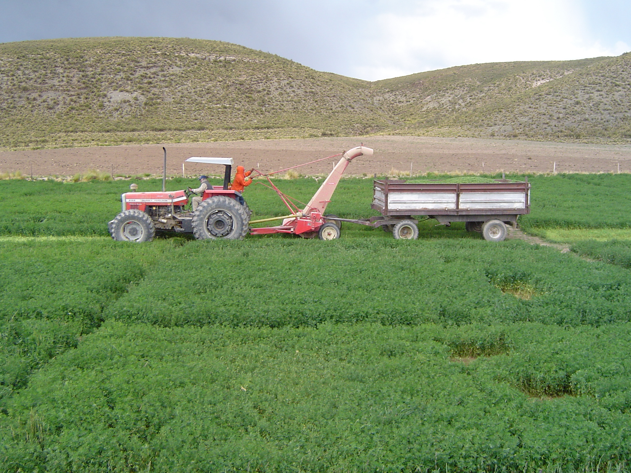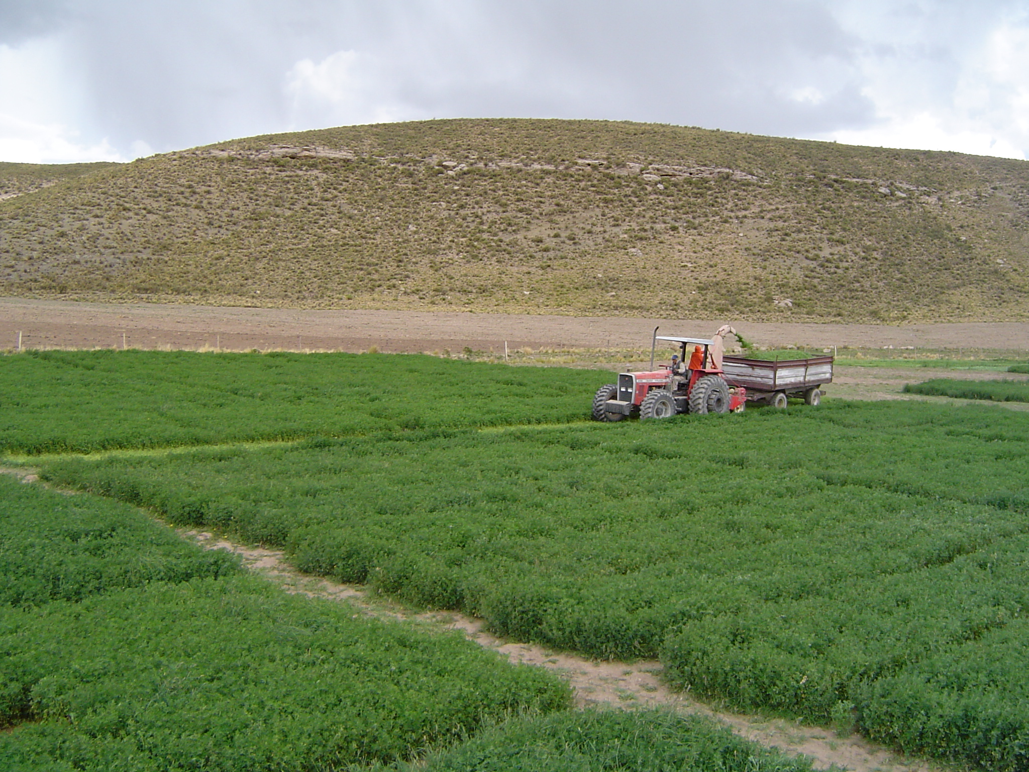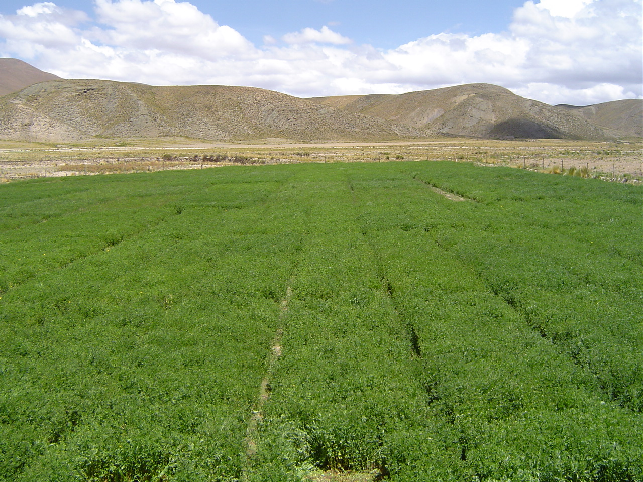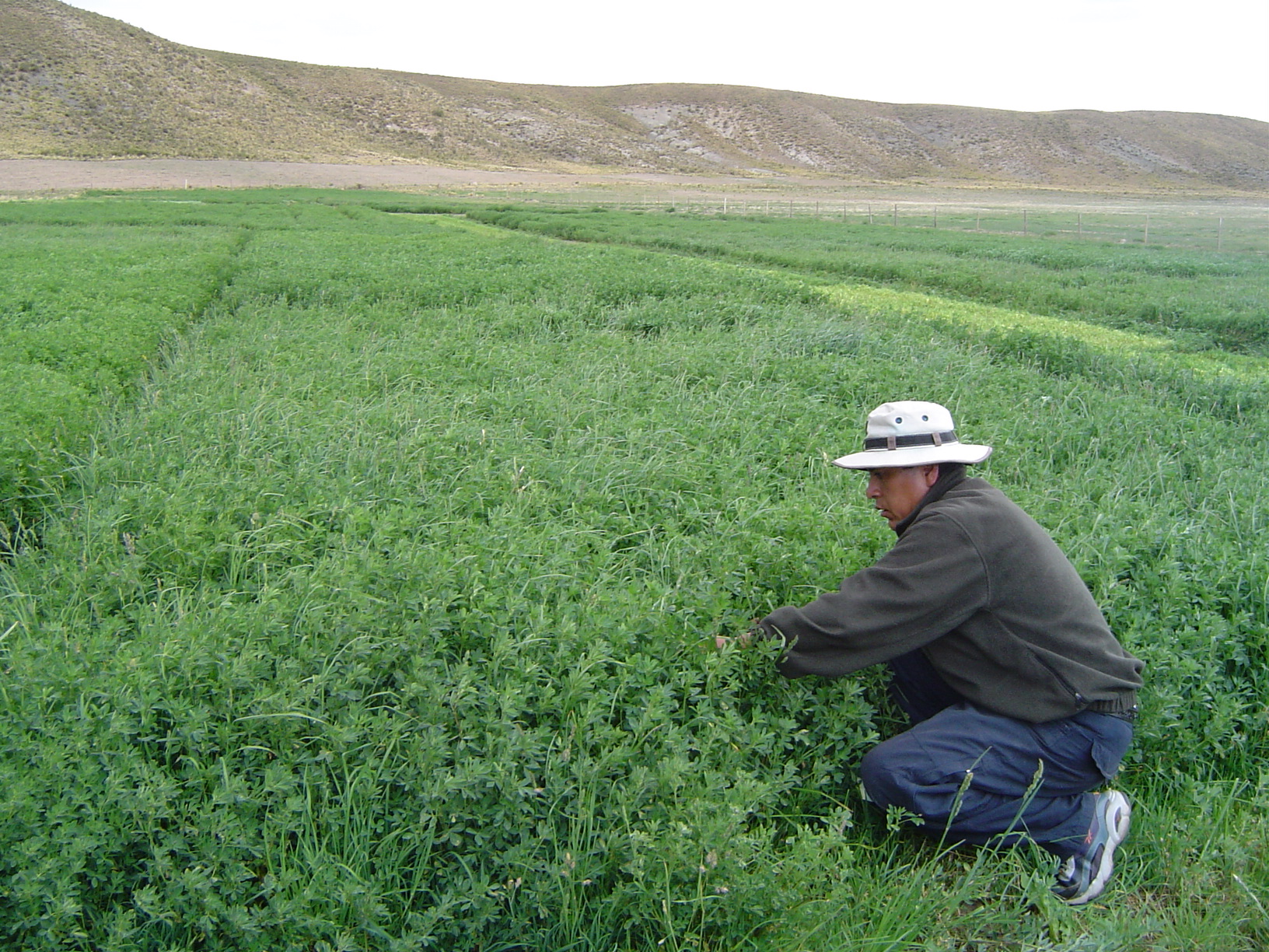 Parcelas de evaluación de variedades de alfalfa en el altiplano central de Oruro. Trabajos conjuntos entre el Centro de Investigación de Forrajes (CIF-UMSS) y el Centro Experimental Agropecuario Condoriri (CEAC-UTO). (© CIF "La Violeta", CEAC, 2000). |
