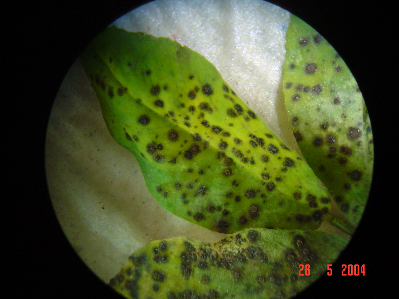 Vista a detalle de síntomas de la viruela de la alfalfa (Pzeudopezisa medicaginis), una de las principales enfermedades fungosas de la especie, con mayor incidencia en condiciones del valle antes que de las alturas del altiplano. (© CIF "La Violeta", 2005). |
