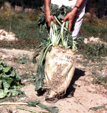 Desarrollo de la parte radicular en la variedad Corona (procedente de Holanda), en evaluaciones realizadas en "La Violeta" en los años 70. En la fotografía, una raíz de casi 20 kg de peso fresco. (© CIF "La Violeta", 1978).