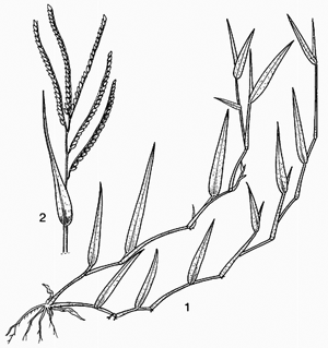 Brachiaria decumbens Stapf. 1. Hábito de crecimiento de tallos y hojas. 2. Inflorescencia (Schultze-Kraft, R. & Teitzel, J., 1992). |