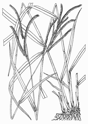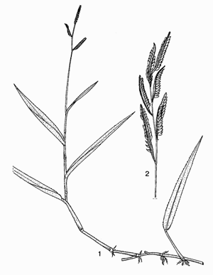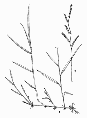 Brachiaria dictyoneura (Fig. & De Not.) Stapf. 1. Hábito de crecimiento de tallos y hojas. 2. Inflorescencia (Schultze-Kraft, 1992). |