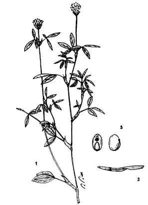 Trifolium alexandrinum L. 1: rama con inflorescencia; 2: foliolo; 3: semillas. (Ríos, 1996). |