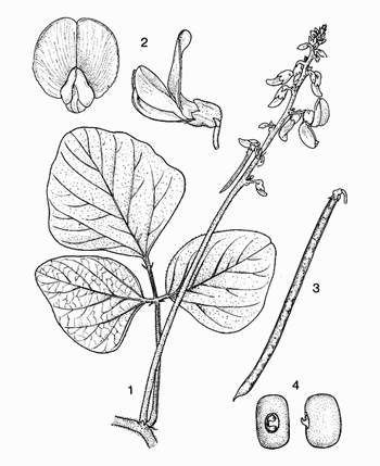 Pueraria phaseoloides (Roxb.) Benth. 1: rama con inflorescencia; 2: flor, vista lateral y frontal.; 3: fruto (vaina); 4: semillas. (Halim, R., 1992). |